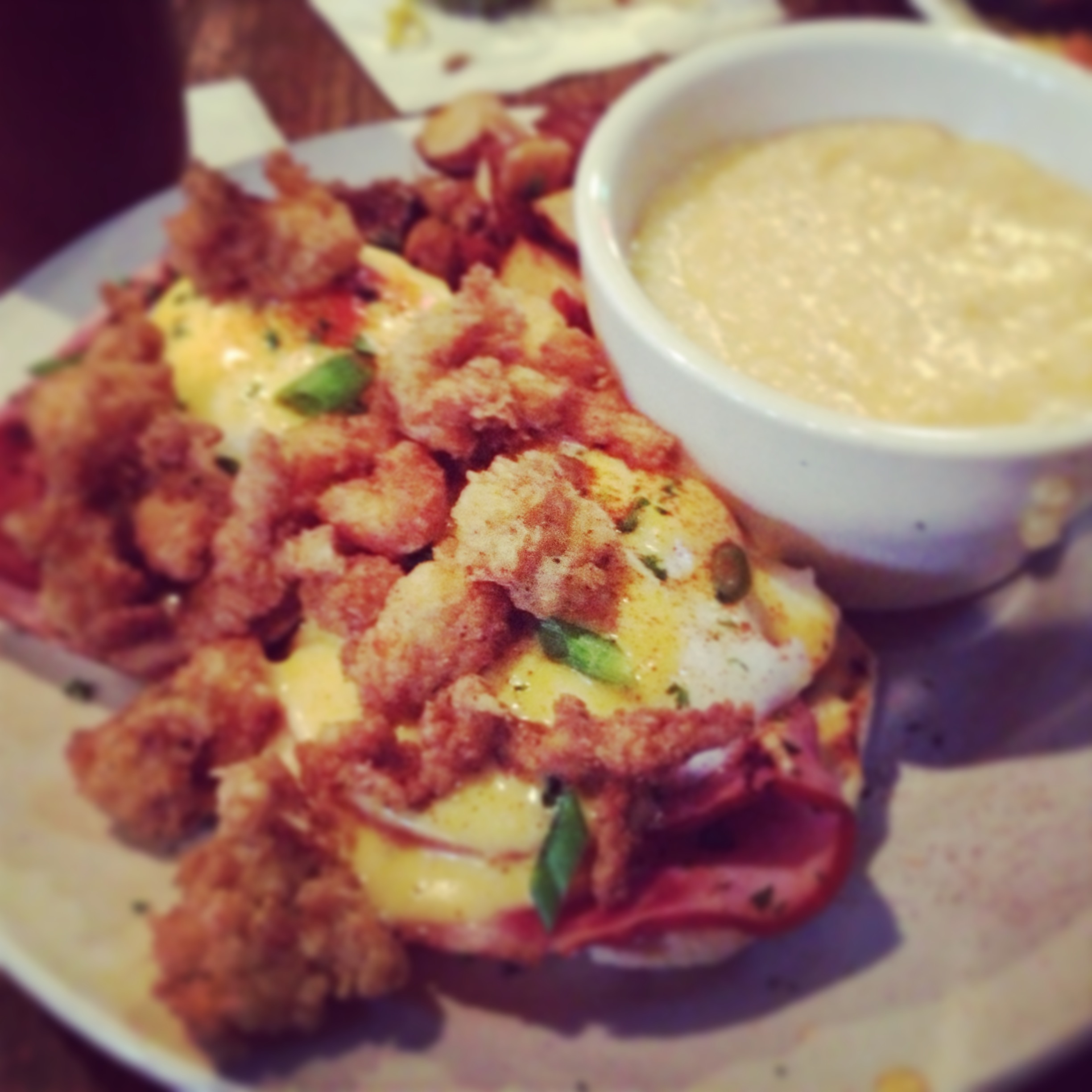 The next morning, because we hadn’t had enough, we went to the Chimes for Brunch. I had The Benediction, which is like an eggs benedict, served on English muffins, with ham, tomatoes and fried crawfish tails. My fiancé had the crawfish omelet accompanied by a bloody Mary. It was great southern comfort food on a cold Sunday morning in January (Louisiana cold, not meant to be confused with New England cold).