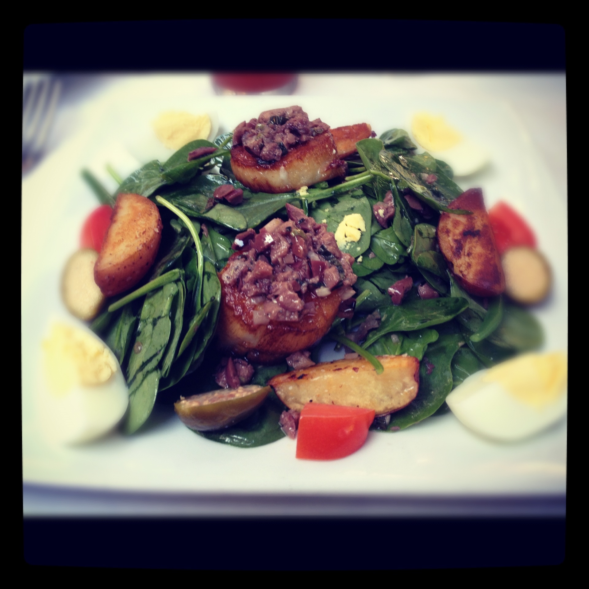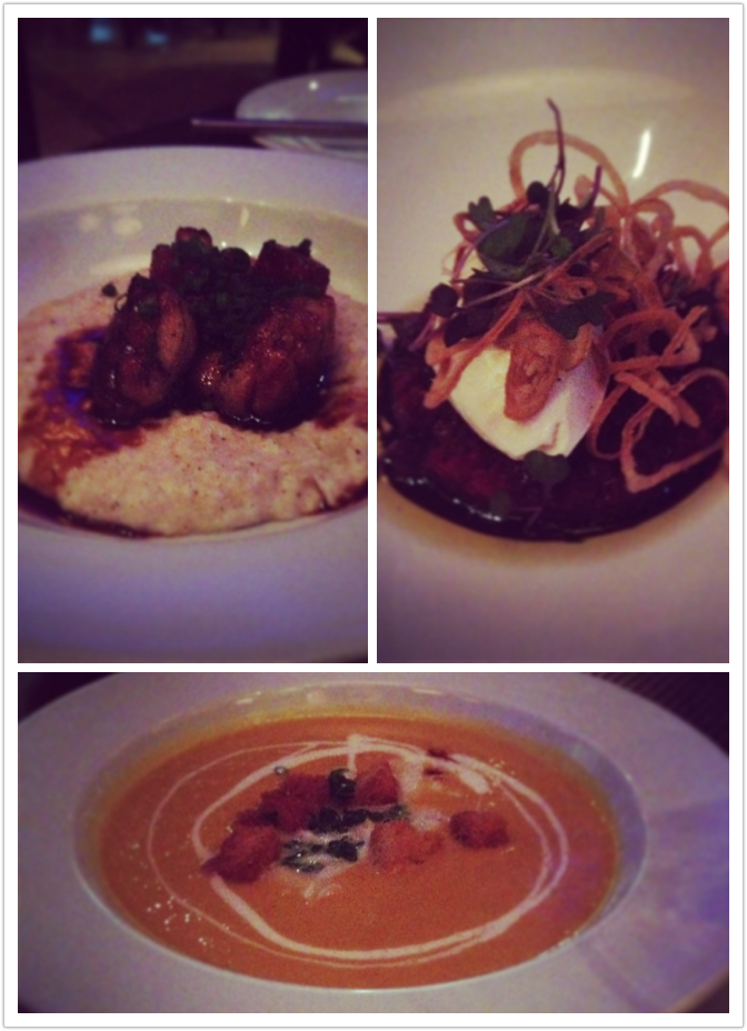 Top from Left: Pan Roasted Sweet Breads over grits; Roasted Beet Salad; Roasted Butternut Squash Soup