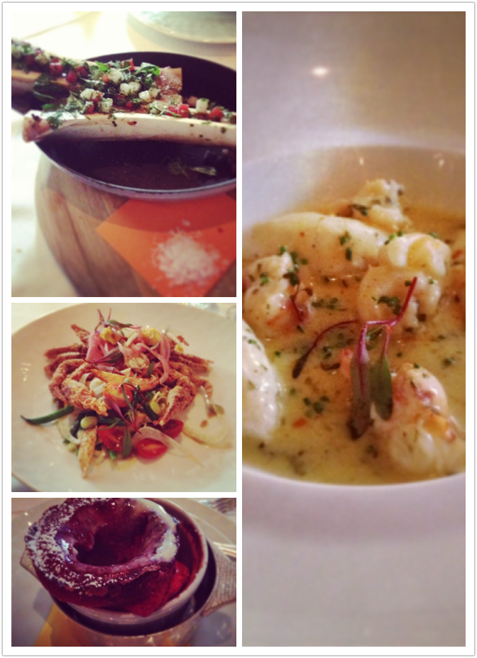 Clockwise from left: Roasted Bone Marrow, Ricotta Gnocchi, Red Velvet Souffle, and Soft Shell Crab